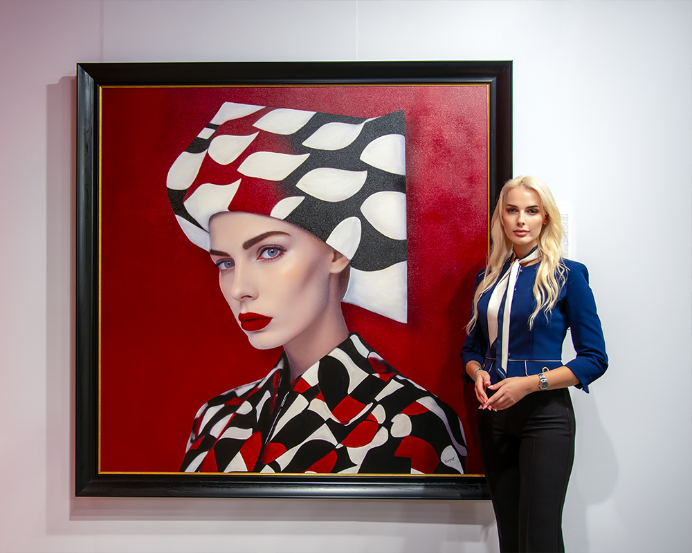 Klasik ustaların zarafetini taşıyan Queen of Illusions, geçmiş ile bugünü aynı bedende toplar. Sakin bir yüz ifadesi, yumuşak ışık ve titiz detaylar izleyeni yaklaştırırken; dama desenli fon modern dünyanın kırılgan gerçekliğini ima eder.